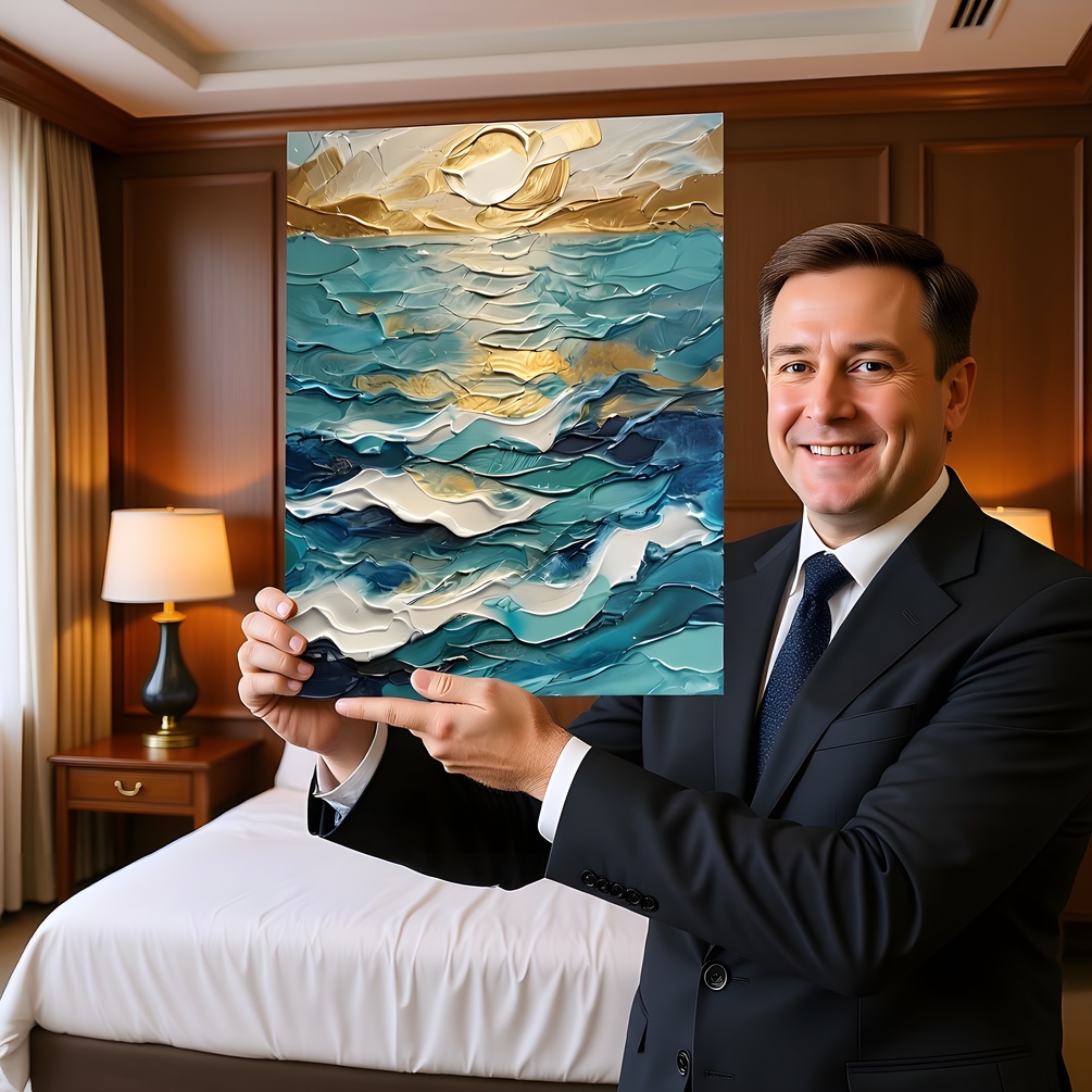 This artwork, with its elegant depiction of ocean waves and golden sunlight, exudes a luxurious and tranquil vibe. It would be a versatile choice for Luxury accommodations